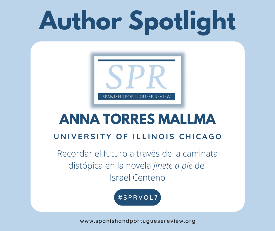 Anna’s article “Recordar el futuro a travĂ©s de la caminata distĂłpica en la novela Jinete a pie de Israel Centeno” explores the representation of the imaginary of the residual (non)citizen in the 21st century through the “caminante” in the contemporary novel Jinete a pie (2014) by Venezuelan author Israel Centeno. The author focuses primarily on the themes of spatial displacement and deconstruction, bodily dysfunctions, and the role of resignification of the experience of pain and fear which threatens to weaken aspects of the community.